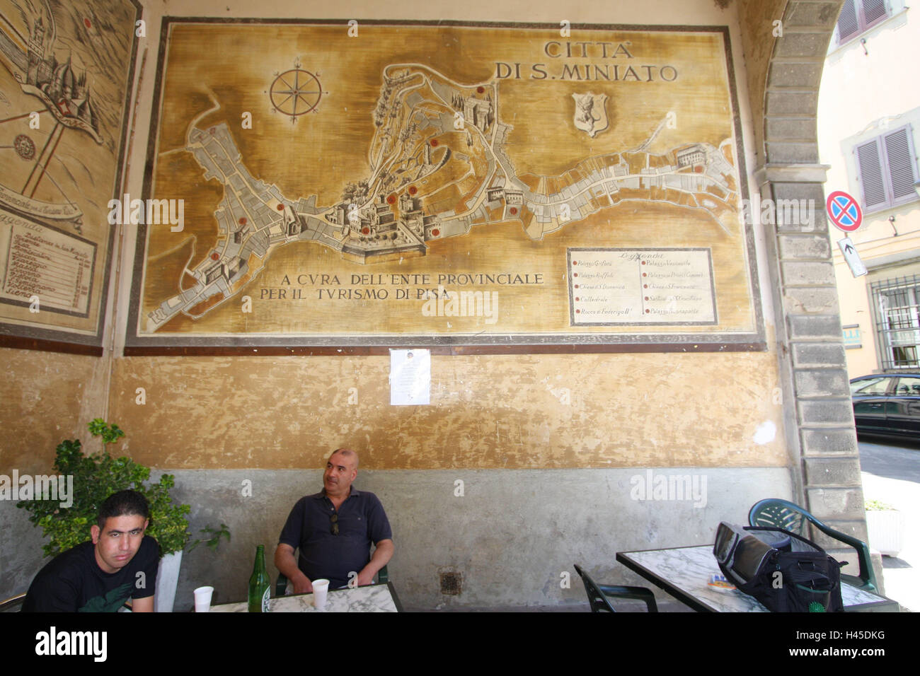 Italie, Toscane, San Miniato, loggia, peinture murale, plan de ville, café, touristiques, le modèle ne libération, la ville, la destination, le lieu d'intérêts, d'un bâtiment, d'architecture, d'arcades, façades, fresque, peinture, plan, personne,